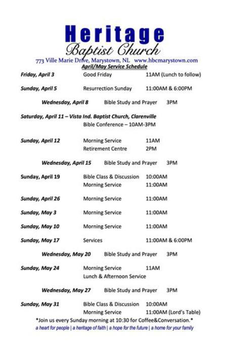 Thank you for visiting the online home of Heritage Baptist Church. If you would like to attend our church, please feel free to come to any of our regularly scheduled services (see schedule below).As well, all of our Sunday and Wednesday services are broadcast LIVE on Facebook and YouTube. If you are not sure what to expect, why not go to our 'Watch' page and view one of our recent services. If you have a prayer request or if there is something else we can do for you, feel free to contact us using the link or information on our 'About Us' page.