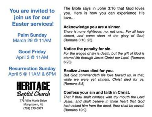 Thank you for visiting the online home of Heritage Baptist Church. If you would like to attend our church, please feel free to come to any of our regularly scheduled services (see schedule below).As well, all of our Sunday and Wednesday services are broadcast LIVE on Facebook and YouTube. If you are not sure what to expect, why not go to our 'Watch' page and view one of our recent services. If you have a prayer request or if there is something else we can do for you, feel free to contact us using the link or information on our 'About Us' page.